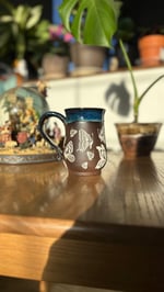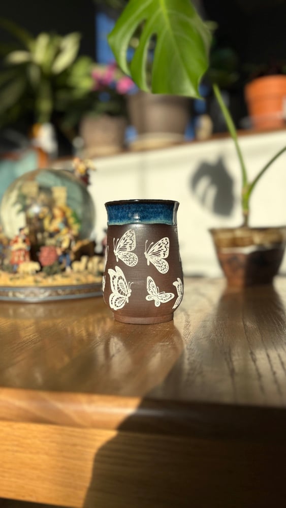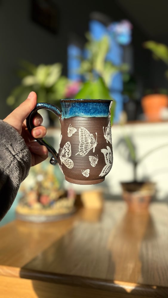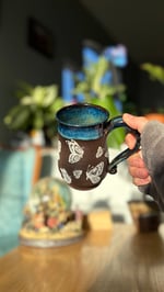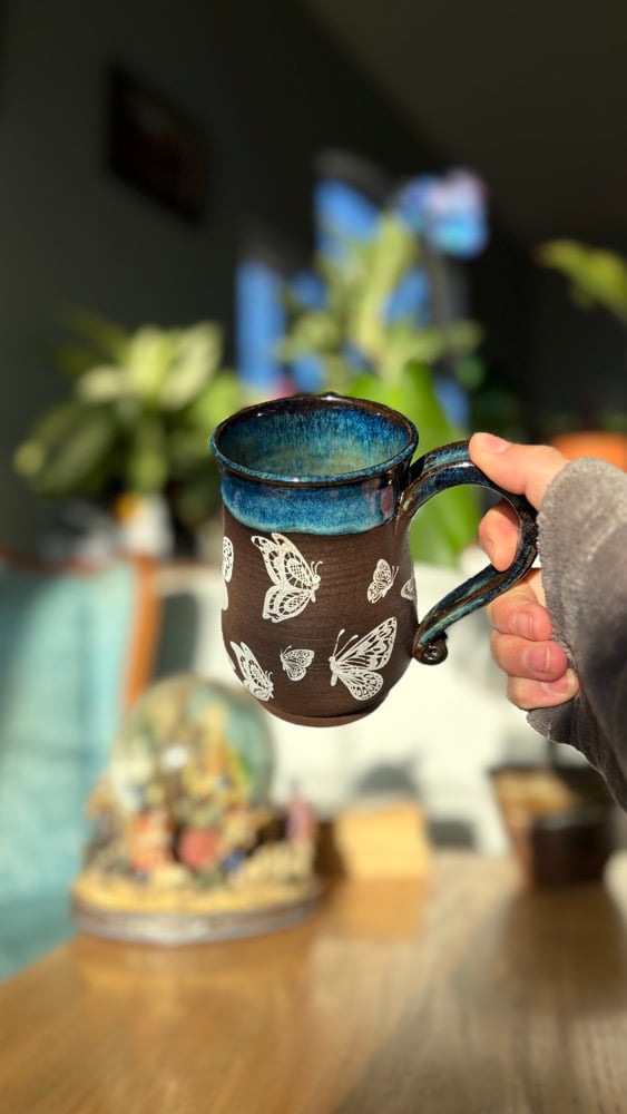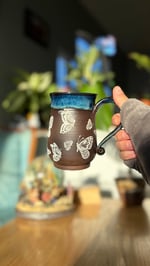 Handmade ceramic mug with white butterflies and a blue glaze. Holds roughly 14 oz. Microwave and dishwasher safe