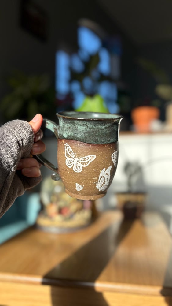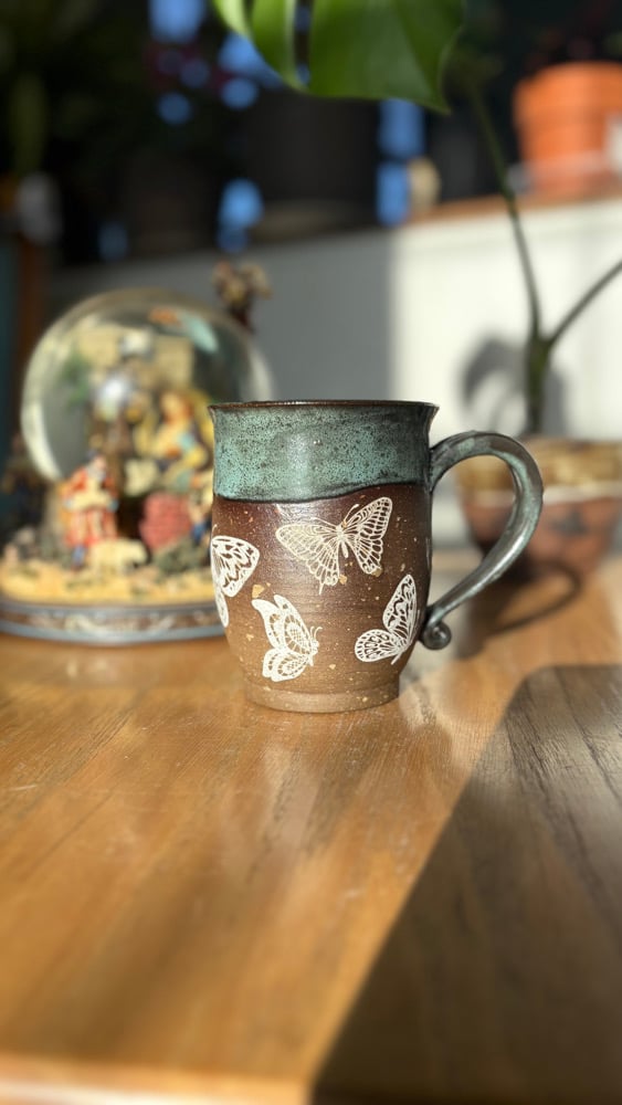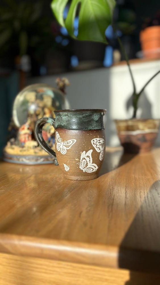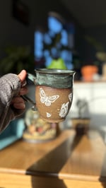 Handmade ceramic mug with white butterflies and a green glaze. Holds roughly 14 oz. Microwave and dishwasher safe