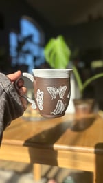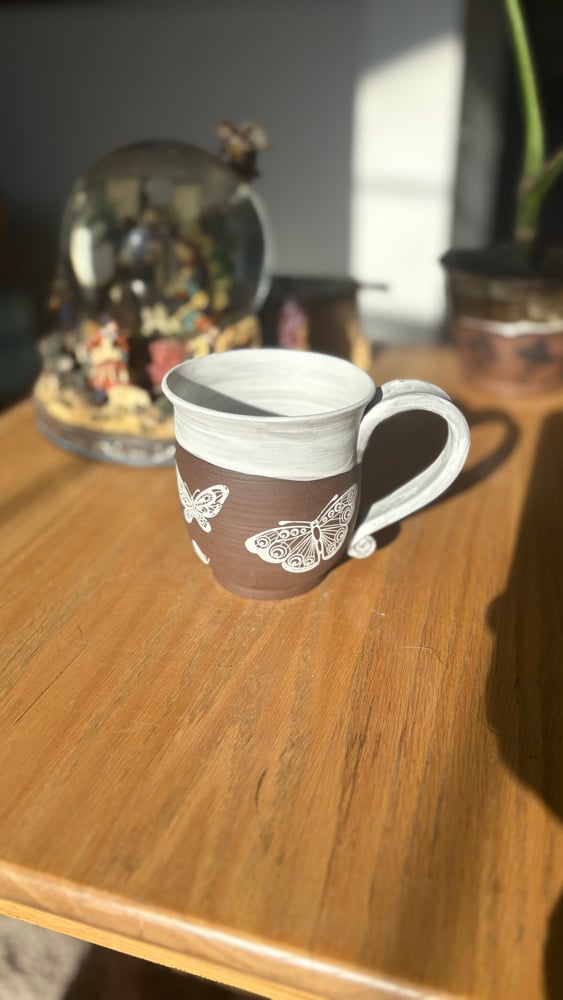Handmade ceramic mug with white butterflies and a white glaze. Holds roughly 12 oz. Microwave and dishwasher safe