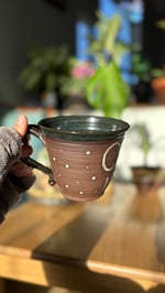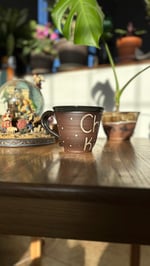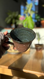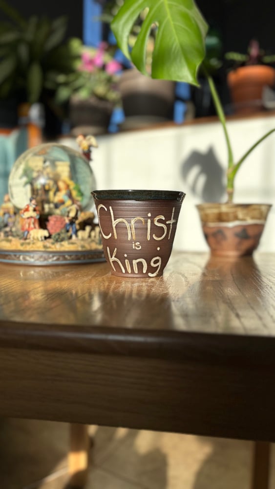 Handmade ceramic mug with “Christ is King” and a blue glaze. Holds roughly 14 oz. Microwave and dishwasher safe