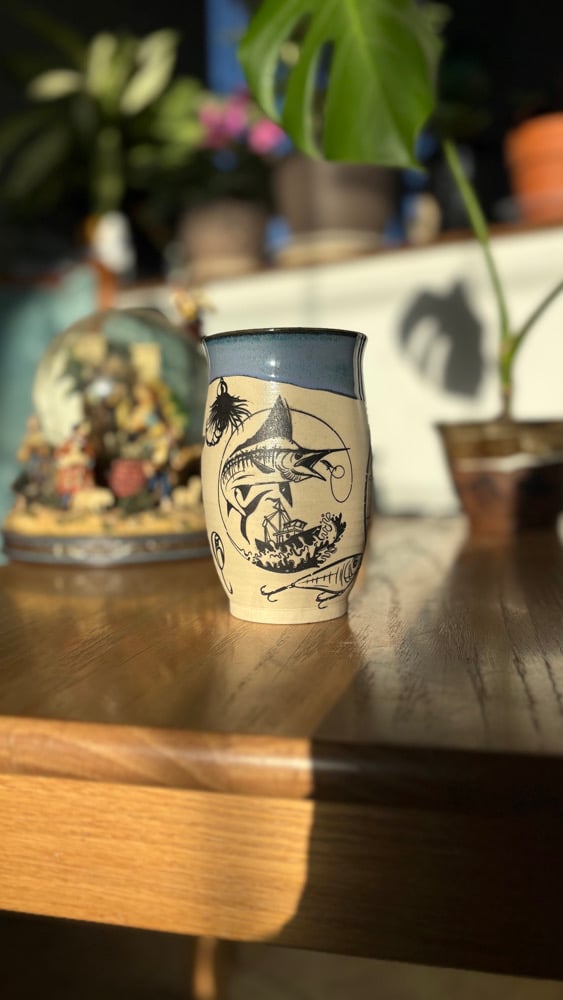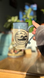Handmade ceramic mug with a fly fishing design and a green glaze. Holds roughly 14 oz. Microwave and dishwasher safe