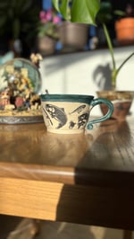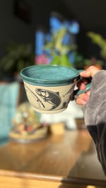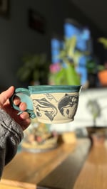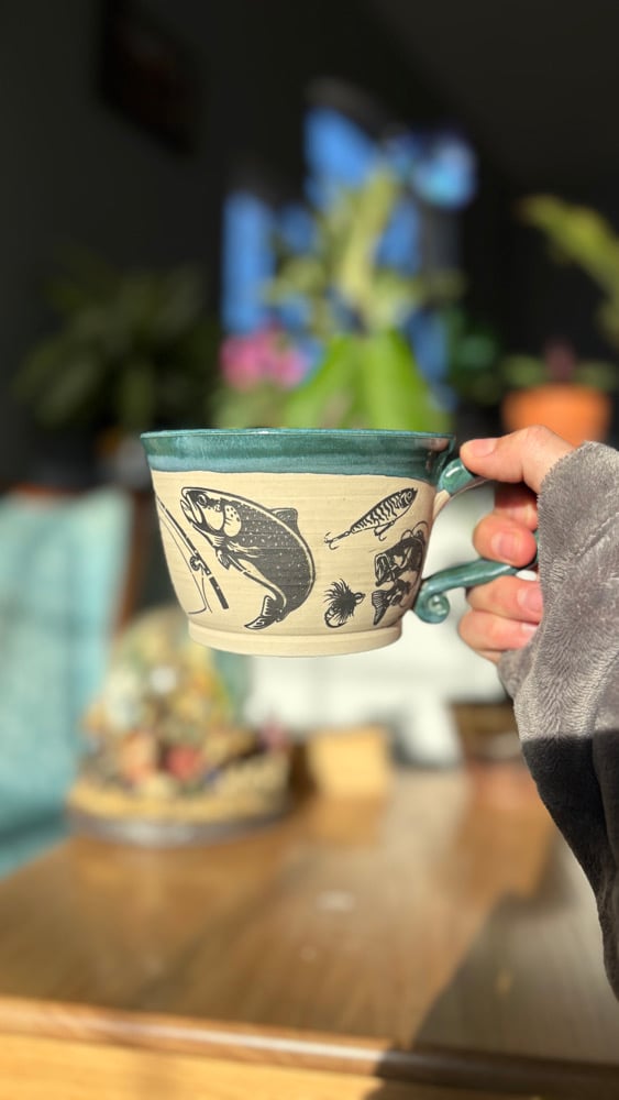 Handmade ceramic mug with a fishing design and a green glaze. Holds roughly 14 oz. Microwave and dishwasher safe