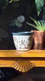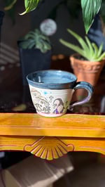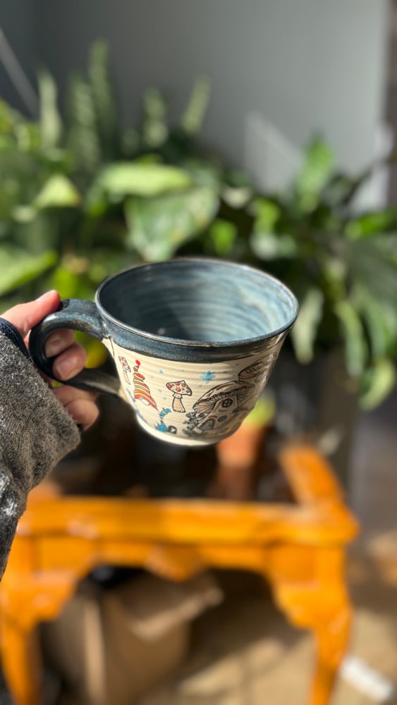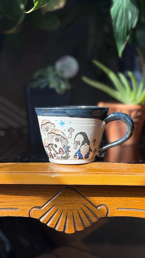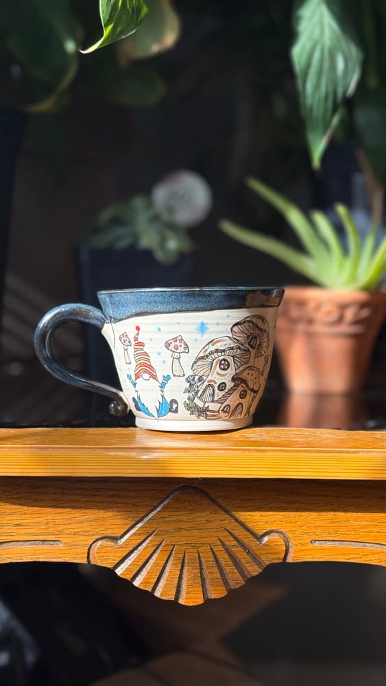 Handmade ceramic mug with a Christmas gnome design and a blue glaze. Holds roughly 14oz. Microwave and dishwasher safe.