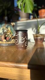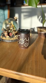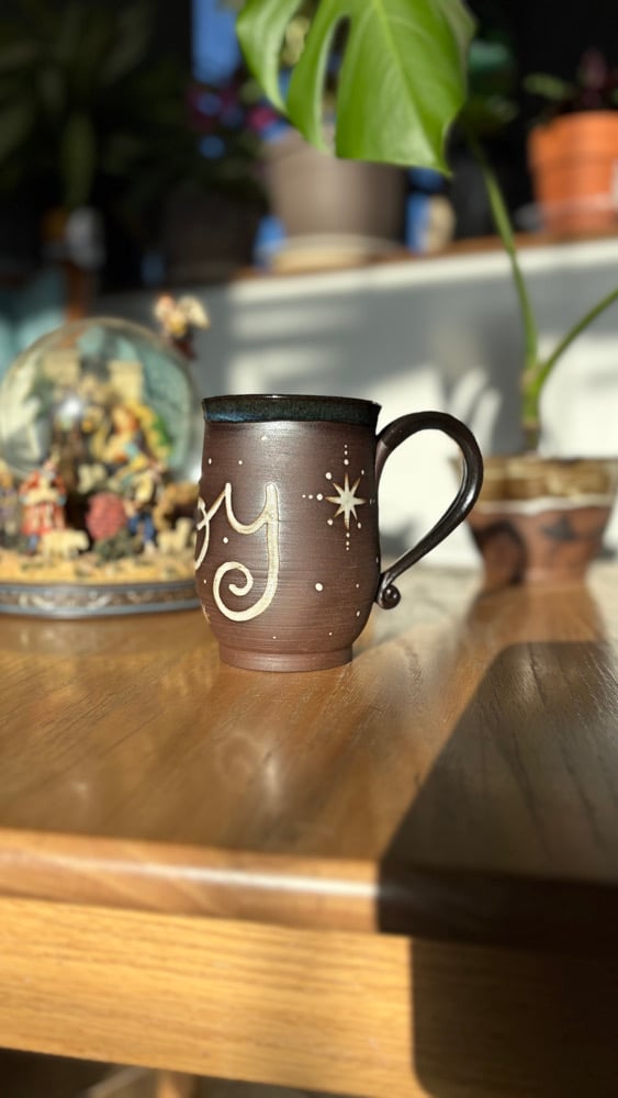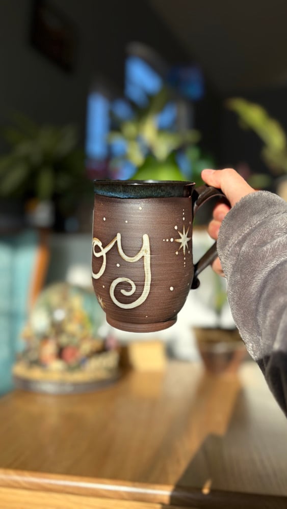 Handmade ceramic mug with “joy” and a blue glaze. Holds roughly 14 oz. Microwave and dishwasher safe