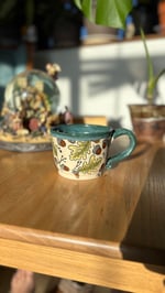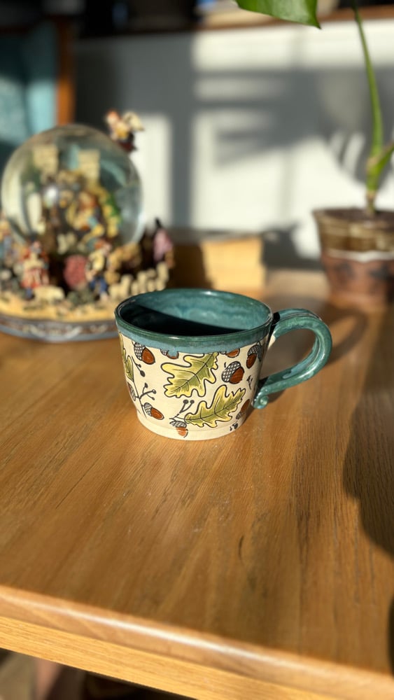 Handmade ceramic mug with fallen leaves and a green glaze. Holds roughly 14 oz. Microwave and dishwasher safe