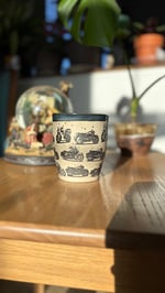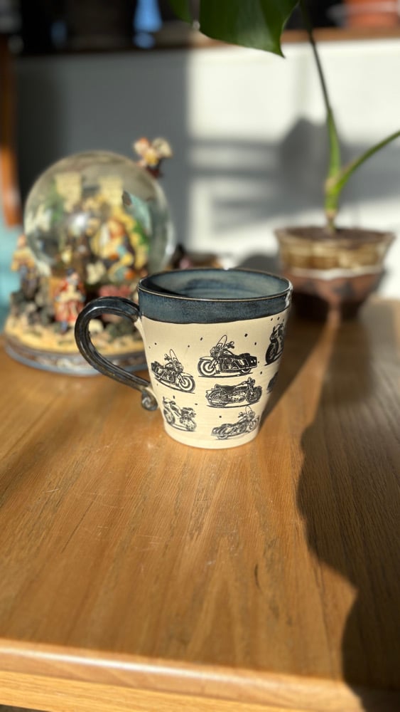 Handmade ceramic mug with motorcycles and a green glaze. Holds roughly 14 oz. Microwave and dishwasher safe