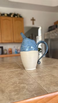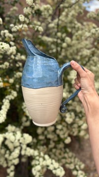 Handmade ceramic pitcher with white clay and a blue glaze. holds ~70oz. microwave, dishwasher and boiling hot water water safe.