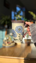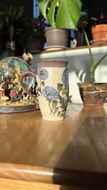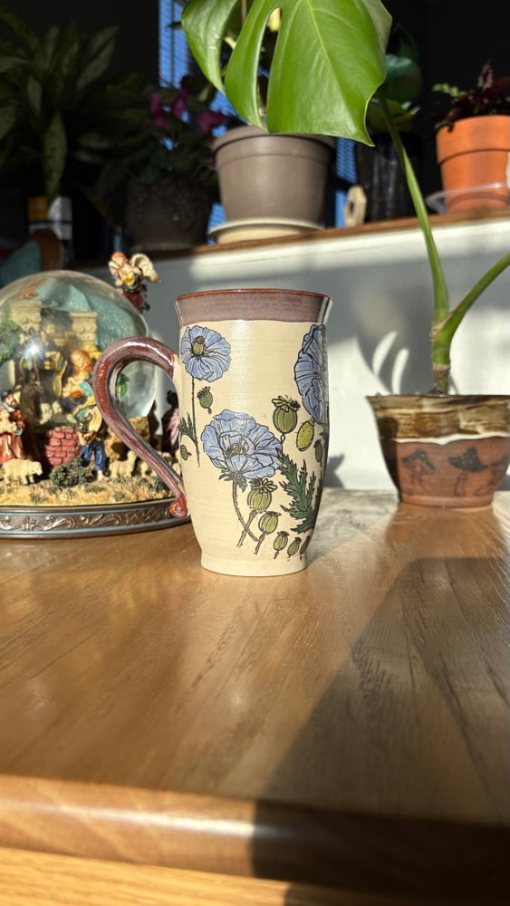 Handmade ceramic mug with purple poppy’s and a purple glaze. Holds roughly 16 oz. Microwave and dishwasher safe