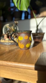 Handmade ceramic mug with pumpkins and a green and orange glaze. Holds roughly 14 oz. Microwave and dishwasher safe