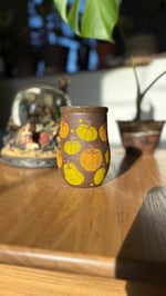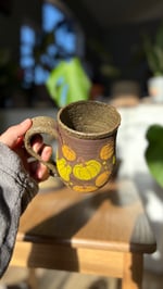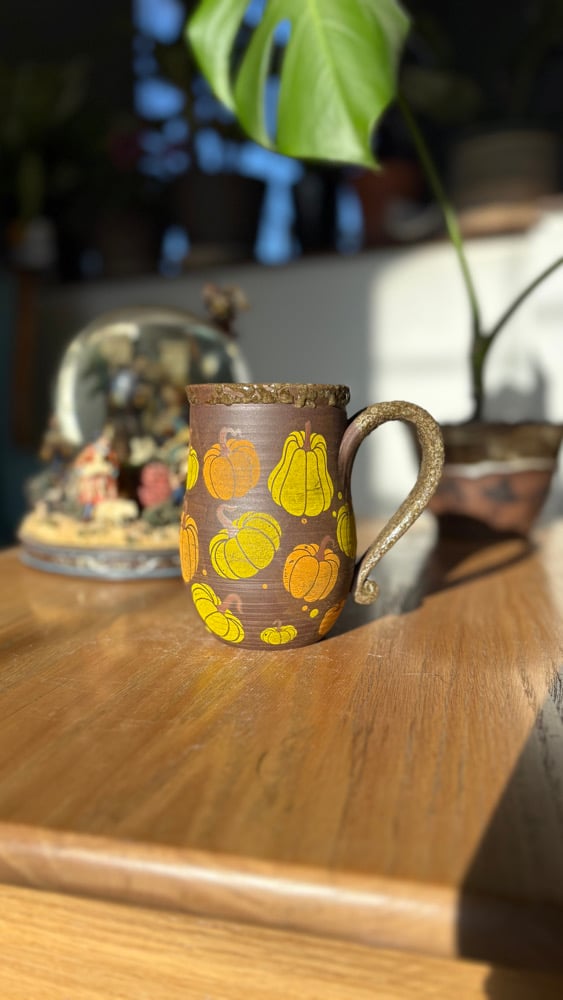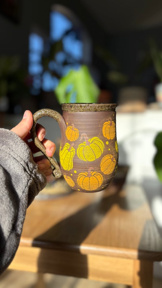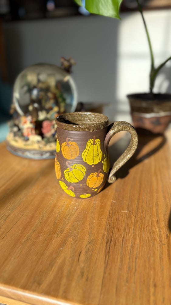 Handmade ceramic mug with pumpkins and a brown glaze. Holds roughly 14 oz. Microwave and dishwasher safe