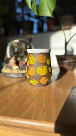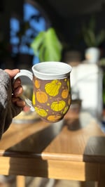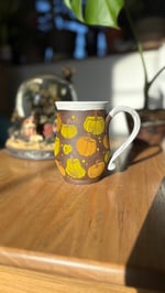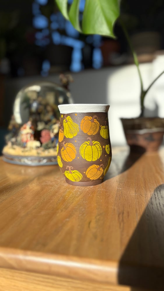Handmade ceramic mug with pumpkins and a white glaze. Holds roughly 14 oz. Microwave and dishwasher safe