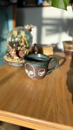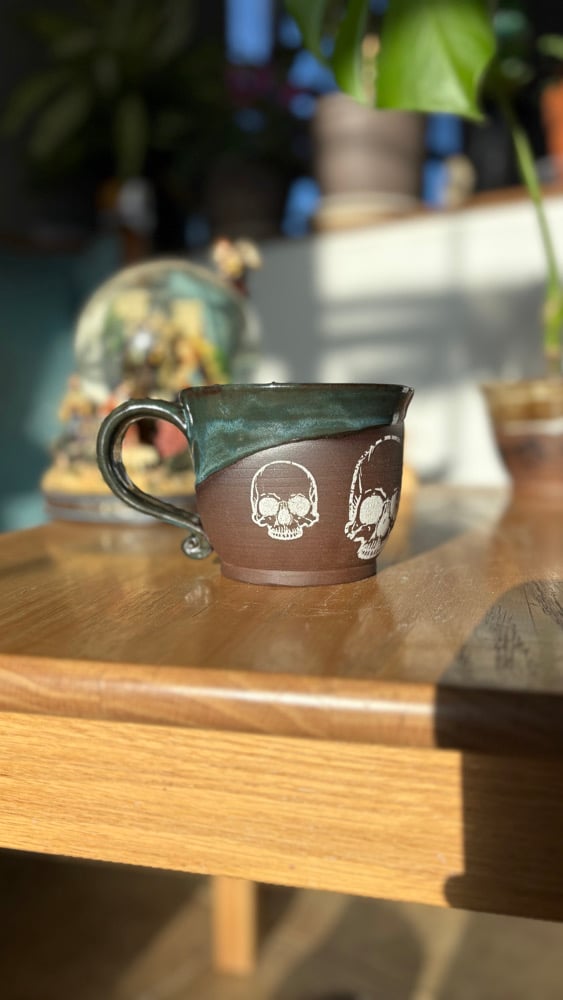 Handmade ceramic mug with white skulls and a green glaze. Holds roughly 14 oz. Microwave and dishwasher safe