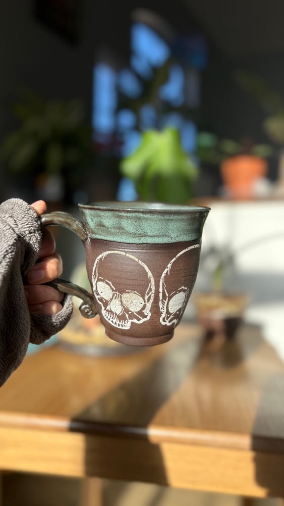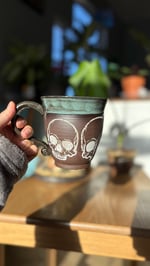 Handmade ceramic mug with white skulls and a green glaze. Holds roughly 14 oz. Microwave and dishwasher safe