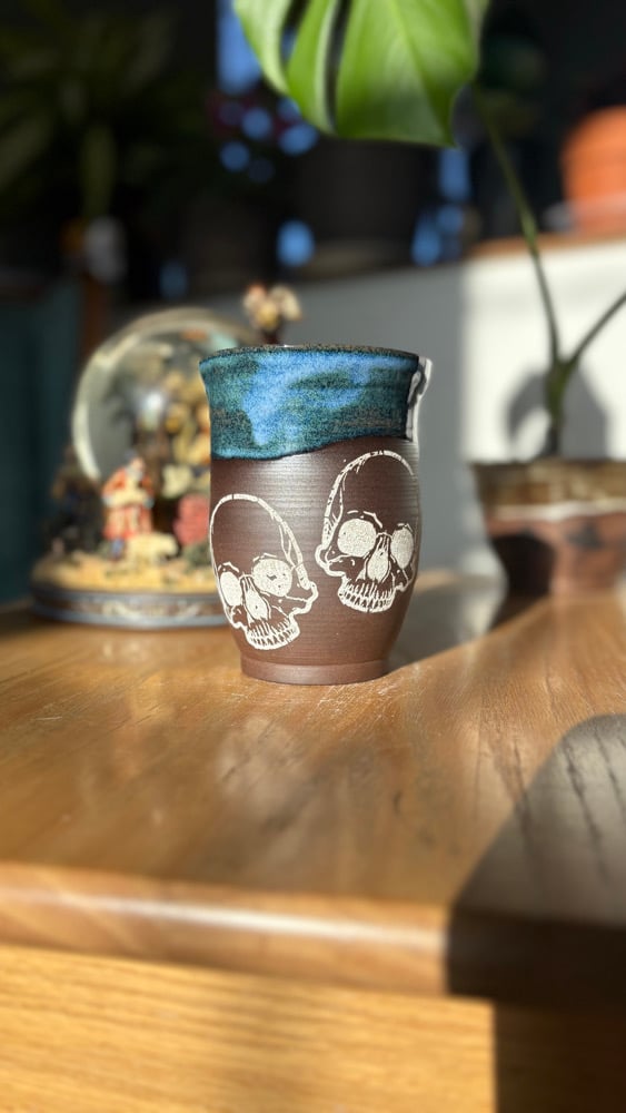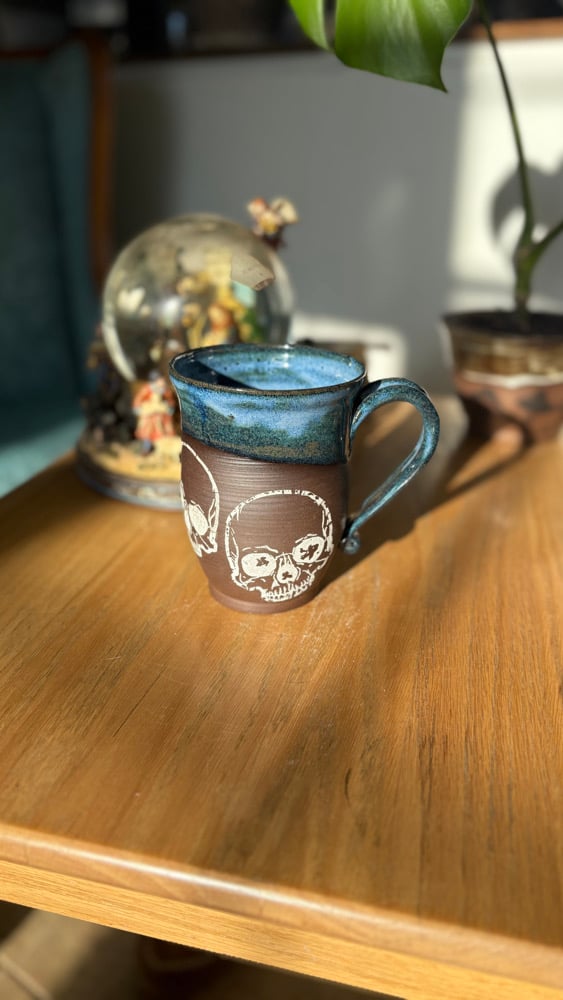 Handmade ceramic mug with white skulls and a blue glaze. Holds roughly 14 oz. Microwave and dishwasher safe