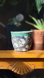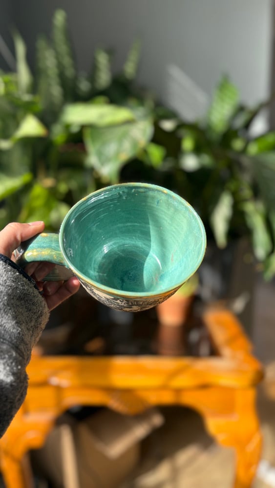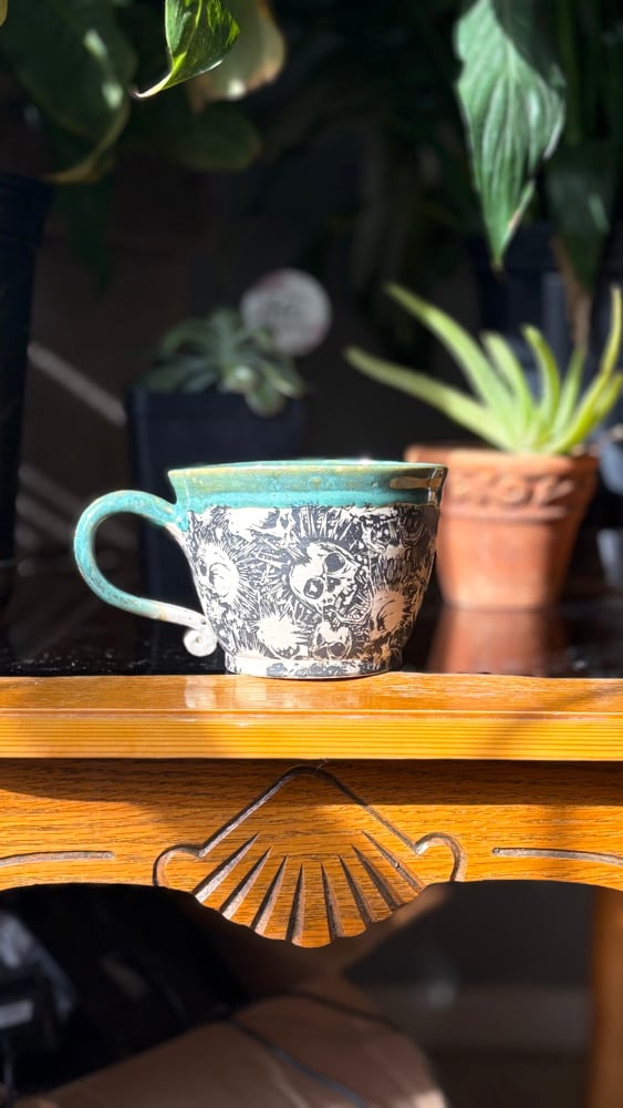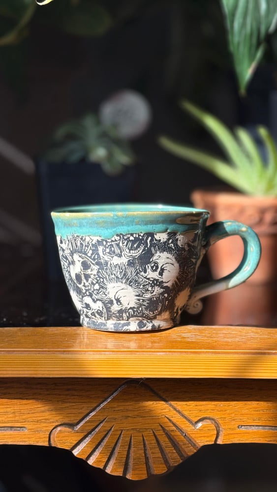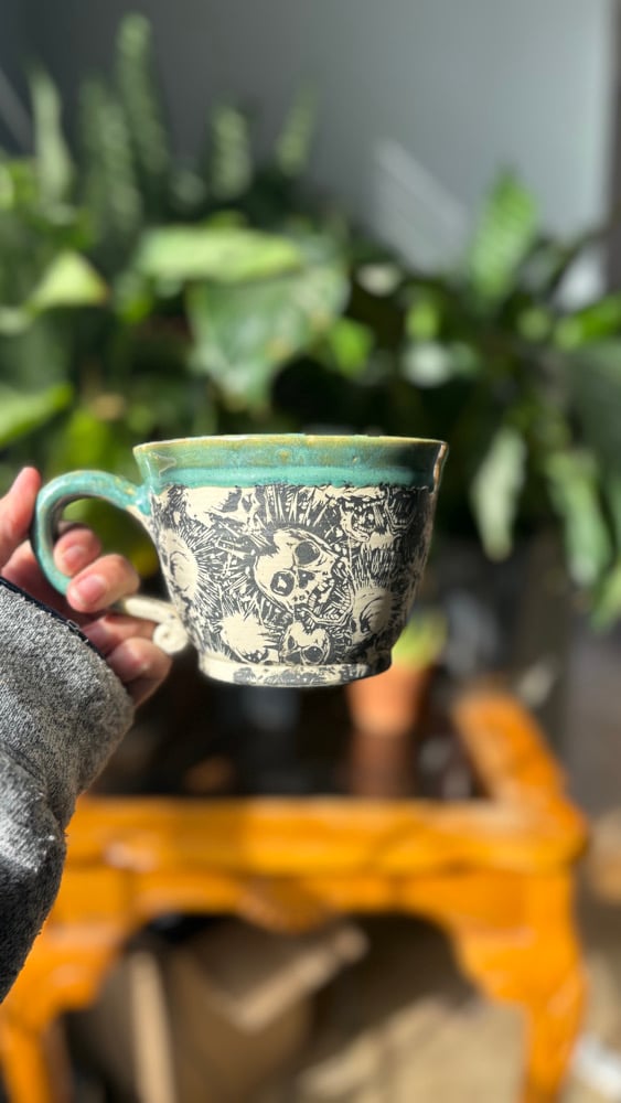Handmade ceramic mug with skulls and a green glaze. Holds roughly 14oz. Microwave and dishwasher safe.