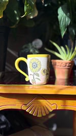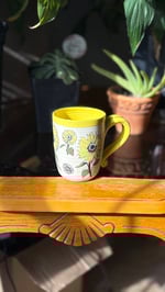 Handmade ceramic mug with sunflowers and a yellow glaze. Holds roughly 14oz. Microwave and dishwasher safe.