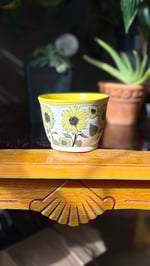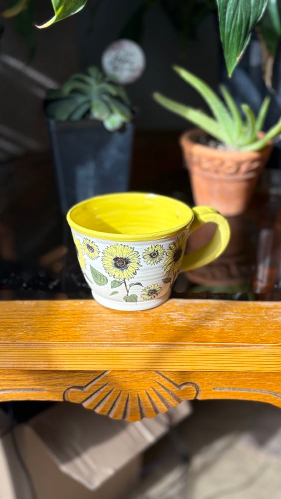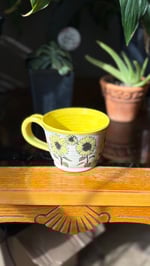 Handmade ceramic mug with sunflowers and a yellow glaze. Holds roughly 14oz. Microwave and dishwasher safe.