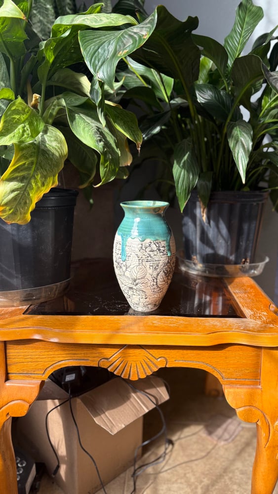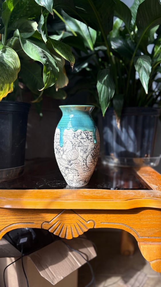 Handmade ceramic vase with flowers all around Roughly 8 in tall 3 in wide